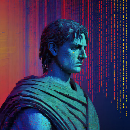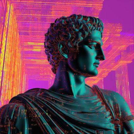 a sculpture of linus from the roman empire stands against vibrant and colorful backgrounds, blending elements of future tech, data visualization, and political illustration. the artwork draws inspiration from the criterion collection's chiaroscuro dramas and the aesthetics of the olympus xa camera. the dark cyan and crimson hues add depth and intensity to the composition. ai generated