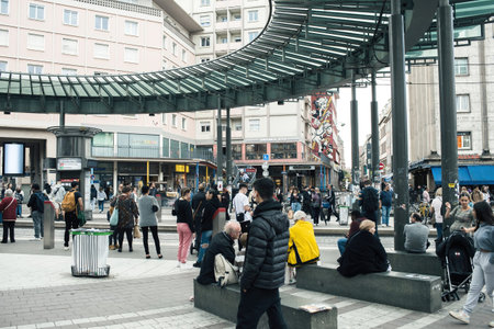 Strasbourg, France - Oct 28, 2022: A bustling crowd of pedestrians visits the city of Strasbourg in Alsace, France, with the tramway and modern architecture of Homme de Fer station visible in the background