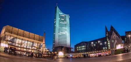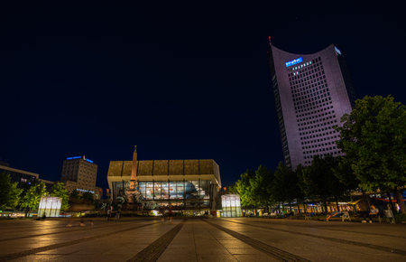 Leipzig, Germany - July 02, 2022: The Gewandhaus concert hall and City Hochhaus on the Augustus square. The Mende fountain in front of the concert hall. The square illuminated by light. Leipzig at night