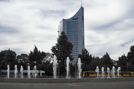 Water fountain at Rossplatz in Leipzig with view to City-Hochhaus Leipzig