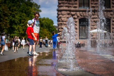 People visit the fountain in Frankfurt, Germany.