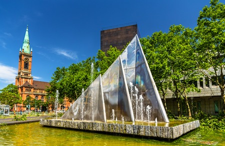 A fountain and the Johannes Church in Dusseldorf, Germany