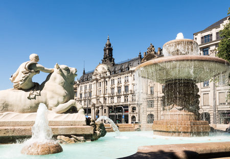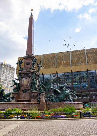 Leipzig, Germany - June 25, 2022: The Mendebrunnen at the Augustus square. The water fountain in front of the Gewandhaus. Bronze figure are grouped around a granite obelisk in a water basin