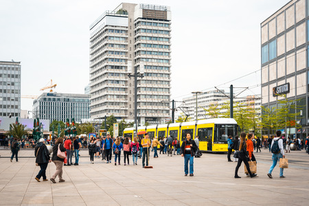 BERLIN, GERMANY - MAY 08, 2014: Turists visiting Alexander Platz, the central square in East Berlin, which was designed by German architect Peter Behrens