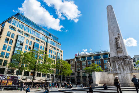 Amsterdam, Netherlands - September 7, 2018: National Monument on Dam Square, memorial to fallen soldiers during the second world war, with people around in Amsterdam, Netherlands