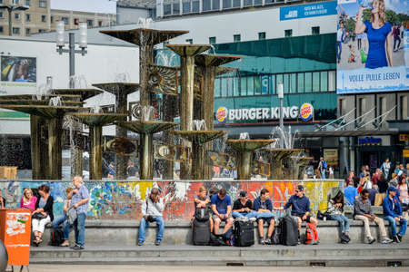 BERLIN - JULY, 2016: People sit on benches and enjoy the day at Wittenbergplatz area of Berlin. KaDeWe department store is also in the view.
