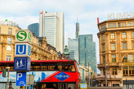 Frankfurt am Main, Germany - January 07, 2019: view from Central Station to the skyscrapers of Frankfurt with unidentified people. Frankfurt is the major financial centre of the European continent