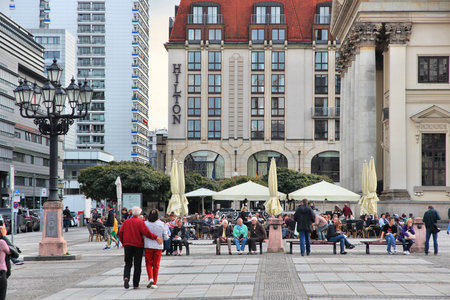 BERLIN, GERMANY - AUGUST 26, 2014: People visit Gendarmenmarkt square in Berlin. Berlin is Germany's largest city with population of 3.5 million.