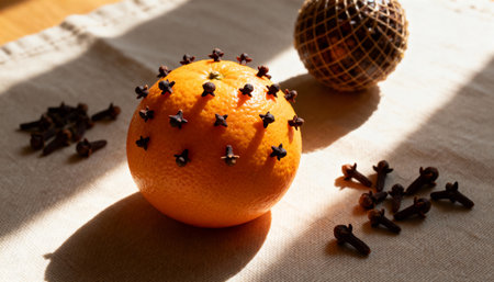 Orange adorned with cloves arranged in a pattern, placed on a beige fabric surface. Scattered cloves and a decorative ball in the background, illuminated by warm sunlight.