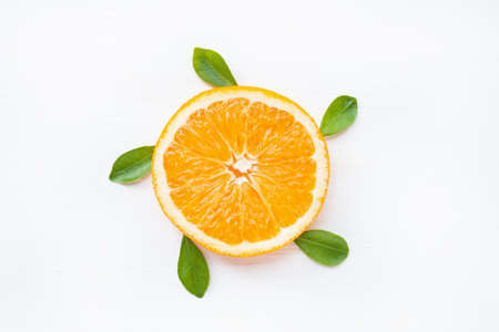 Close-up of fresh oranges, whole and halved on a white background with copy space, horizontal