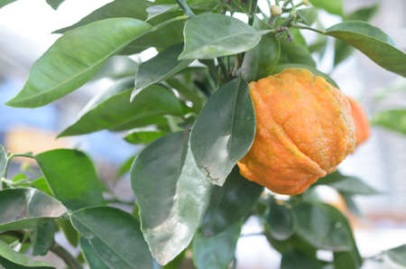 Orange tree with ripe fruits. Selective focus. Shallow depth of field.