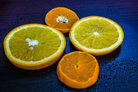 Texture of sliced orange, fresh and healthy fruit, which is rich in juice and vitamin c. Orange background.