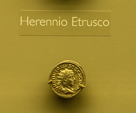 Close-up of a Roman coin featuring Herennius Etruscus. This detailed artifact showcases the craftsmanship and historical significance of Roman coinage.