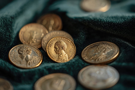Shiny gold coins scattered on teal fabric surface with selective focus highlighting detailed engravings and currency texture.