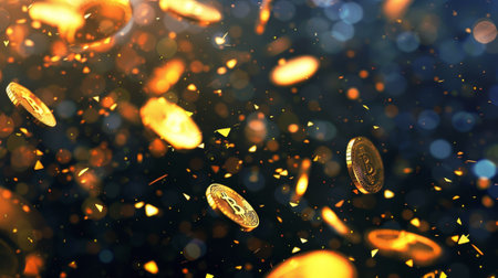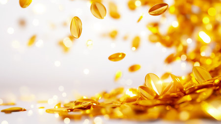 Golden coins are falling gracefully against a clean, bright background, creating an atmosphere of richness and celebration, ideal for enhancing digital spaces.