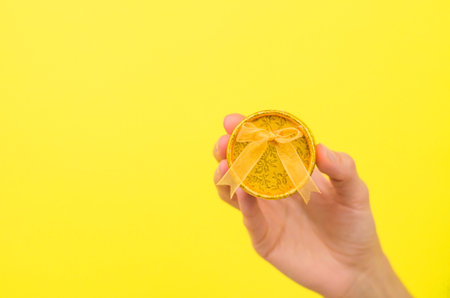 Yellow gift box in a female hand on a yellow background