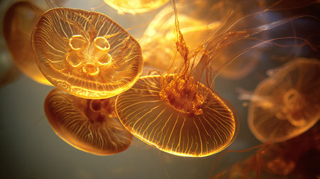 3d illustration of jellyfish floating in water, illuminated by sunlight