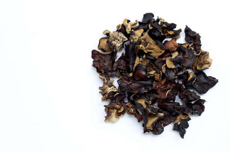 Dry black fungus, tree ear or wood ear mushroom isolated on white background. Dried auricularia polytricha also known as cloud ear, black mushroom, jelly fungus or cloud ear fungus