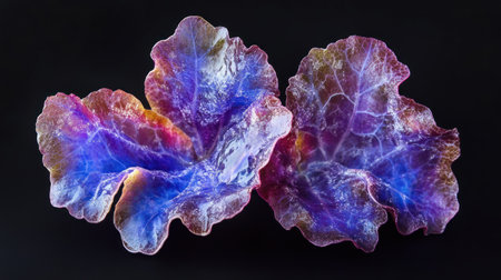 Two translucent glass sculptures with a wavy, organic shape, displaying a vibrant iridescence with hues of blue, purple, and orange, creating a luminous and ethereal effect.