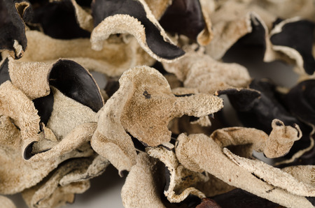 Dried black fungus on white background.