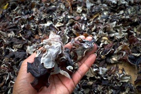A hand with dried wood ear mushrooms (Auricularia auricular), black jelly mushroom.