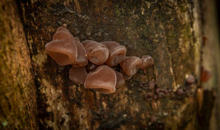 Wood ear mushroom on old wood log in the rain forest landscape.