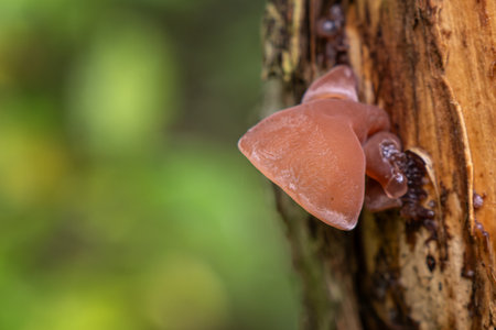 Jelly ear mushroom growing on a decaying trunk outdoors in the forest.
