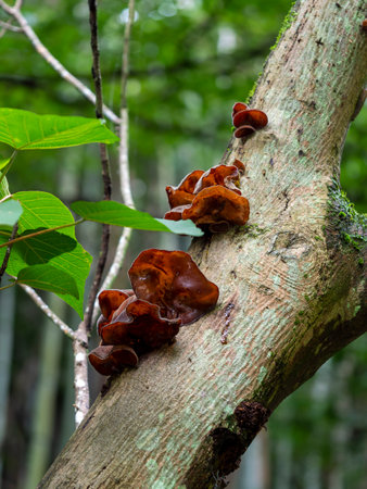 Tasty Judas Ear mushrooms, Auricularia auricula-judae, growing on tree, a common Chinese vegetable food