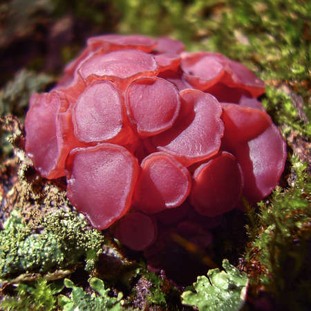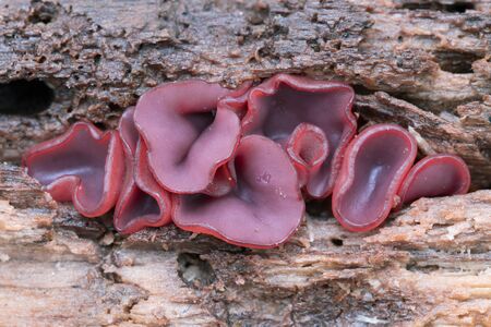 Ascocoryne sarcoides mushrooms (slime mould) on an old stump