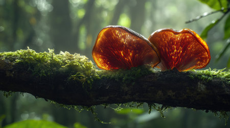 Pair of Reishi mushrooms on a mossy branch, glowing slightly in filtered forest sunlight
