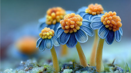A close-up of lichen growing on the side of an iron pipe. The yellow spores and blue moss form intricate patterns that resemble mushrooms or corals. Macro photography, nature photography, natural lighting. Nikon D850 camera with Nikon AF-S Nikkor 70-200mm f/4E ED VR lens. --ar 53:30 --v 6.1 Job ID: ce105d86-295e-4d61-8603-2dce429c5a01
