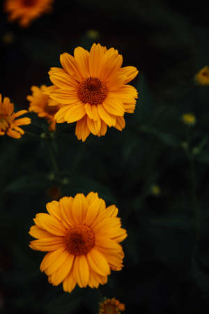 Yellow sunflower like heliopsis flowers on dark green background, low key, wide banner size