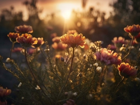 Cosmos flowers bloom in rich orange hues, illuminated by the golden sunlight of a setting sun, creating a picturesque garden atmosphere filled with warmth and beauty. Generative AI.