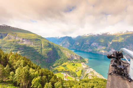 Tourism and travel. Scenic nature landscape. View to picturesque Aurlandfjord and Sognefjord from Stegastein viewpoint, Norway Scandinavia.