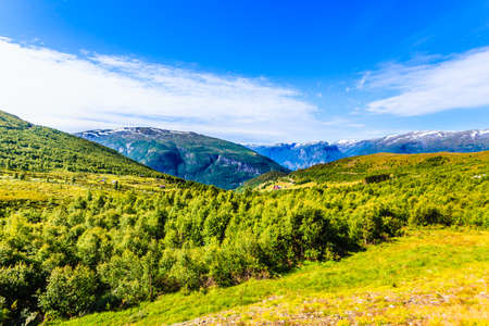Mountain region between Aurland and Laerdal in Norway. Green summer landscape. National tourist scenic route Aurlandsfjellet.
