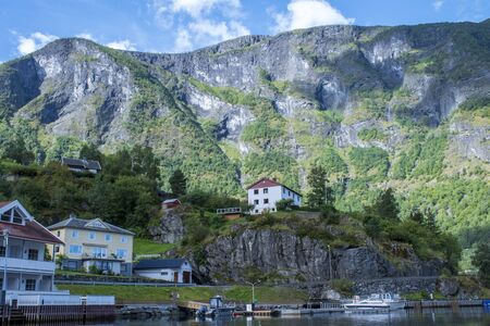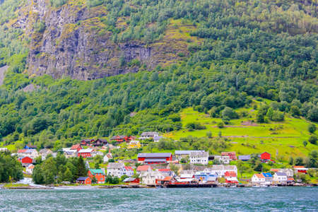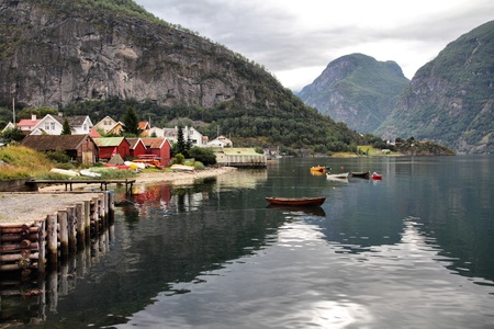 Scandinavian homes houses on shore of the narrowest fjord in Norway - Naeroyfjord.