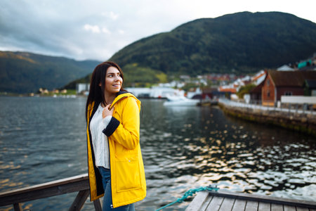 Girl tourist in yellow jacket posing on the lake in Norway. Active woman relaxing in Norway.