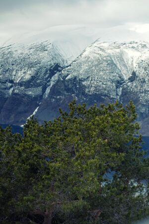 Amazing dramatic view of the fjords and mountains. Aurlandsfjord fjord landscape in Norway Scandinavia. National tourist road known as The snow road.