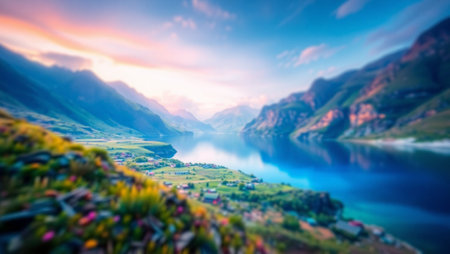a scenic village between mountains and a lake, bathed in sunset's golden light, serene and enchanting