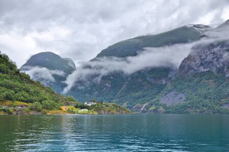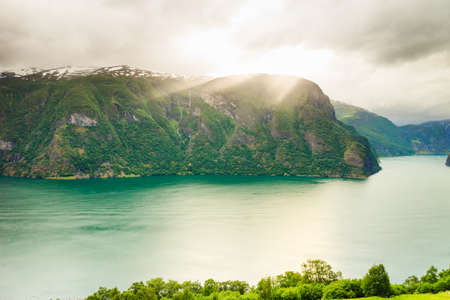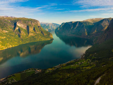 Norwegian beautiful mountain and fjord landscape in Aurlandsfjord Aurland Vestland Sognefjord in Norway.