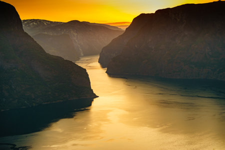 Aurlandsfjord fjord landscape at sunset, Norway Scandinavia. National tourist route Aurlandsfjellet