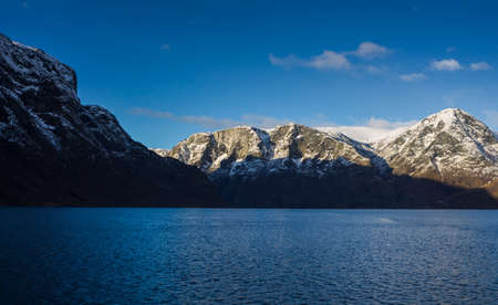 Scenery of water and surrounding mountains of Sognefjord, Norway, Scandinavia