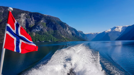 Sailing the Majestic Sognefjord: A Norwegian Flag Charms the Scenic Voyage from Flam to Gudvangen