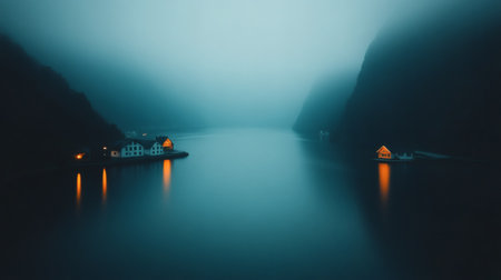 Nestled amidst towering cliffs and soft fog, charming houses light up along a still fjord, creating an atmosphere of peace during the early morning hours.