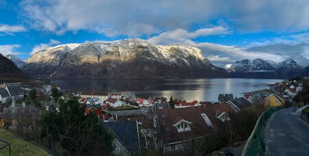Aurlandsfjord Town Of Flam at dawn. Beautiful Nature Norway natural landscape.