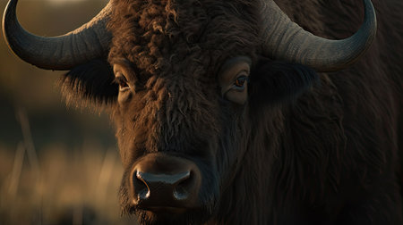 A close-up view of a bison's face reveals its strong features and expressive eyes. The golden light of twilight enhances the natural beauty of this magnificent creature against a peaceful backdrop.