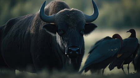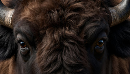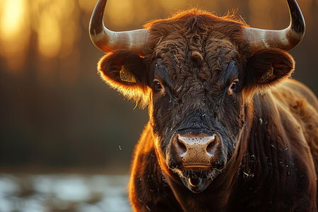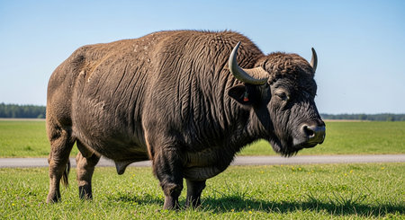 A powerful bull stands proudly, showing its impressive horns and rich fur texture in stunning detail, surrounded by a calm landscape.