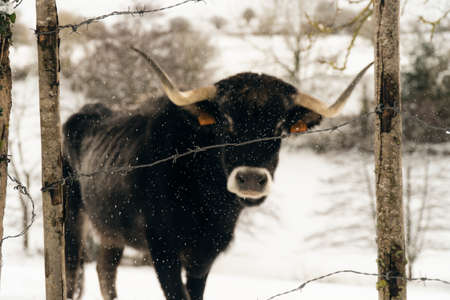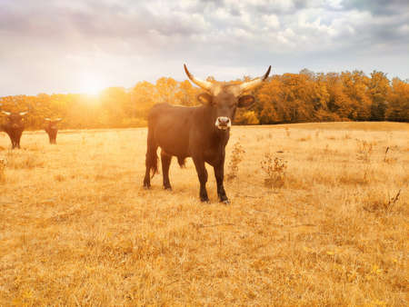 Portrait of a black bull in the autumn forest. Animal in the nature.