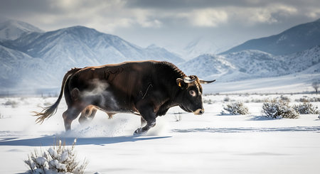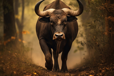 An AI generated illustration of A majestic black bull strolls along a sunlit path