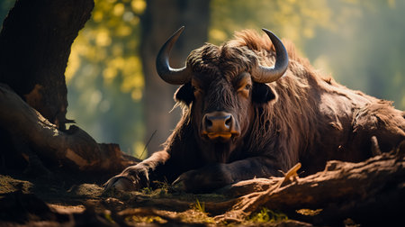 A huge bison resting on a shade under a tree. Buffalo in Wildlife.